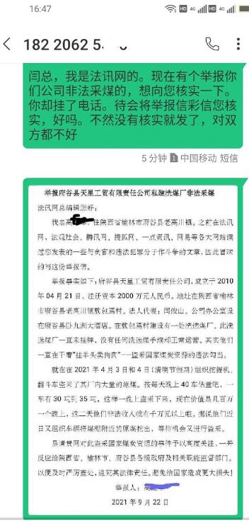 举报府谷县天星工贸有限责任公司私建洗煤厂非法采煤 法讯网总编辑您好: 我名高红军,住陕西省榆林市府谷县老高川镇。之前在法讯网,法观社会、腾讯网、搜狐网、一点资讯、网易等各大网站读过您发表的一些与贪官和违法犯罪分子作斗争的文章,因此冒昧的写这份举报信。 举报事实如下:府谷县天星工贸有限责任公司,成立于2010年04月21日。注册资本2000万元人民币。地址在陕西省榆林市府谷县老高川镇敖包焉村。法人代表:闫俊山。公司办公室设在府谷县卧九洲大酒店。在敖包焉村建设有一处洗选煤厂。此洗选煤厂一直未挂牌,没有任何洗选煤手续却正常运营。其实他们一直在干着“挂羊头卖狗肉”——盗采国家煤炭资源的违法勾当。 就在在2021年4月3日和4日(清明节假期)组织挖掘机、翻斗车盗采了其厂内大量的原煤。按每天晚上40车估量吧,一车有30吨到35吨,这样一晚上盗采下来,现在价值是几百万一个晚上,这二天他们非法收入就有千万元以上啦。据说他们近日又组织车辆将煤棚附近的原煤挖出,等待机会又进行盗采。 垦请贵网对此盗采国家煤炭资源的事件予以高度关注,一并反应给陕西省、榆林市、府谷县各级政府及相关职能监督部门。以便及时严厉查处,追究其法律责任。避免给国家造成更大损失! 举报人:高红军 2021年9月22日 ![]() 隔着这约60米处就是该公司煤棚,四处都是摄像头,无法靠近拍摄 ![]() 电话及短信天星工贸公司法人闫俊山核实举报情况均未获回复 |