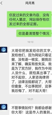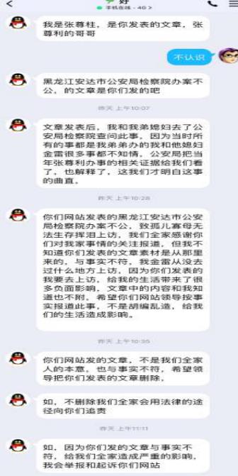 黑龙江人的黑:网站为她讨回钱后,为了删帖花样百出 独立撰稿人 李海波 金雷是黑龙江绥化市安达市人,她找人联系网站发布了她的投诉信,事情解决她和联系人多次要求网站删除。之后解决不满意,再次联系网站要求发布,并承诺不再删帖。然而和对方签订协议后,对方再次要求删帖,且对网站先是请求删帖并表示多花些钱,这之中有一人称是当事人哥哥,又称不认识当事人是网易工作人员。不成后又威胁网站要起诉…… 发贴控诉安达公安局检察院办案不公 承诺解决后求删帖 1月18日,自称是中法新闻法制网的张耀东通过他人联系到法治之窗网,其发来《黑龙江安达市公安局检察院办案不公,致使孤儿寡母无法生存挥泪上访,公理何在》的稿件,法治之窗予以发布。帖子反映金雷的爱人张遵利(已去世)于2017年干建筑工程,留下很多外债,位于安达市悦达小区11一5号商服楼也被债权人骗走,金雷于2021年7月6日到安达市公安局经侦大队立案。安达市公安局于2021年8月4日出具了不予立案通知书; 2021年8月末,我又到安达市检察院申请立案监督。2021年12月31日,安达市人民检察院出具了不予立案监督审查通知书。于是金雷直指安达市公安局检察院办案不公。 ![]() 19日,投诉人金雷和对方当事人达成和解,网贴提供者等人要求法治之窗删除帖子。负责人拒绝后有昵称为“好”的QQ联系,称是网易的,表示花钱删帖但被拒。 ![]() 聊天中他号称黑白都做。 ![]() 之后在金雷发来承诺视频和撤稿申请后,法治之窗无奈关闭了网贴。 再次要求发布网贴并承诺不再删帖 得到26万后花样百出只为删帖 然而在1月24日,张耀东再次联系法治之窗网要求恢复网贴,理由是对方钱给少了,金雷不满意。负责人当即表示删除了不能再发了,对方请求其花钱另外找网站发布,并承诺不再删除。 法治之窗负责人无奈联系法讯网表示发3个网站给1千元。法讯君表示不收费便发布了帖子《黑龙江安达市公安局检察院办案不公,致使孤儿寡母无法生存挥泪上访,公理何在》,之后网报等网站予以转发。但法讯网包括法治之窗负责人等负责人均没有收取费用。 转眼就是春节。2月4日,张耀东打电话给法治之窗负责人,称:卡在公安局里,因为我跟公安局长都通话了,都协调了......事情已经和解了,叫把和解协议书发给联系的网站,看了后就把稿子撤了。 法治之窗负责人称:你发了又撤,撤了又发,现在又撤。张耀东称:“撤了之后不发了,你把它撤了,撤了之后公安局给对方施加压力协调,你不撤公安局不管了。还称:“公安局长我们都是好哥们,还有经侦大队长我们哥们。” 2月5日一早法讯君正在做家务时有18510349999的电话打来,说是中法新闻法制网的张耀东,说是安达的稿件目前达成协议26万元打进金雷的卡里了,卡在公安局那,他和副局长等是好朋友……。听此,我便说对东北人不感冒,我很忙便挂断电话。 ![]() 查询该手机绑定的微信,是这样的。 ![]() 之后有昵称为“好”加网站公布的QQ,表示是金雷丈夫张尊利的哥哥张尊柱,对网站如此恐吓。 ![]() “张尊利哥哥张尊柱”在这里变身为网易工作人员陈海波 ![]() 而之前联系法治之窗的也是这个QQ:2591953811,身份不是张尊利的哥哥张尊柱而是网易的,要给钱删除那帖子的。联系法讯君不能删除,转而再找法治之窗负责人,表示不认识金雷和张尊柱,他是网易工作人员陈海波,被拒后又是一通质问。 ![]() 但之后他表示是金雷的朋友,更是直接威胁要维护他们自己的利益。 ![]() 要求加微信,和QQ语气相同,法讯君便没有通过。 ![]() 看此人朋友圈是空白的,只有一头像。 ![]() 张耀东发给法治之窗微信质问称他自有15个网页都删除了,为啥自媒体不删除?! ![]() 对方发来的协议书 2月6日,张耀东给法治之窗负责人发过来自称是张尊柱的声明,全文如下: 黑龙江安达市公安局检察院办案不公,致孤儿寡母无法生存挥泪上访关于网站发布张尊利(金雷的爱人)与张云江房屋抵押借贷纠纷事件,我本人张遵柱(张道利的亲哥哥)知道内部详情,我弟媳妇金雷在网站发布的举报材料很多存在不实。几家网站发布的黑龙江安达市公安局检察院办案不公,致孤儿寡母无法生存挥泪上访的文章,金雷从没去过任何部门上访,一直在家与孩子生活,网站发表文章说金雷上访,这是编造事实,任何部门没有上访记录,文章内容多处与事实不符,网站发表不实文章后,给金雷和家人造成很大的生活影响,根据《互联网新闻信息服务管理规定》与2021年2月22日实施的《互联网用户公众帐号信息服务管理规定》中第十八条,向工信部和国务院互联网新闻中心举报,决定对发布不实信息的网站追责。特此说明,要求网报,一瞅,法讯,民呼等网站撤稿,以免造成更大影响。2021年金雷到安达市公安局报案,说自家的房子被人骗走了,安达市公安局接到报案后依法进行调查,找到了当事人和相关知情人等依法进行调查核实,证据确凿,认为被告人不够成犯罪,双方是属于经济纠纷,安达市公安局依法出据了不予立案通知书,金雷随后向安达市检察院申请立案监督,安达市检察院接到申请后,依法对此案进行调查核实,核实后认为公安局出据的不予立案理由充分。接到检察院的不予立案监督审查通知后,起初金雷还是想不明白,因为当年的事情是由她爱人张尊利所办,中间有很多过程细节金雷不知细情。经安达市公安局调查后才还原了当年事实的真像