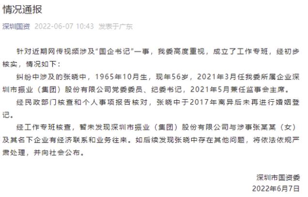 深圳市国资委在其微信公众号上通报,针对近期网传视频涉及“国企书记”一事,深圳市国资委委高度重视,成立了工作专班,经初步核实,情况如下: 纠纷中涉及的张晓中,1965年10月生,现年56岁,2021年3月任深圳市国资委所属企业深圳市振业(集团)股份有限公司党委委员、纪委书记,2021年5月兼任监事会主席。 经民政部门核查和个人事项报告核对,张晓中于2017年离异后未再进行婚姻登记。 经工作专班核查,暂未发现深圳市振业(集团)股份有限公司与涉事张某某(女)及其名下企业有经济联系和业务往来。如后续发现张晓中存在其他问题,将依法依规严肃处理,并向社会公布。 |