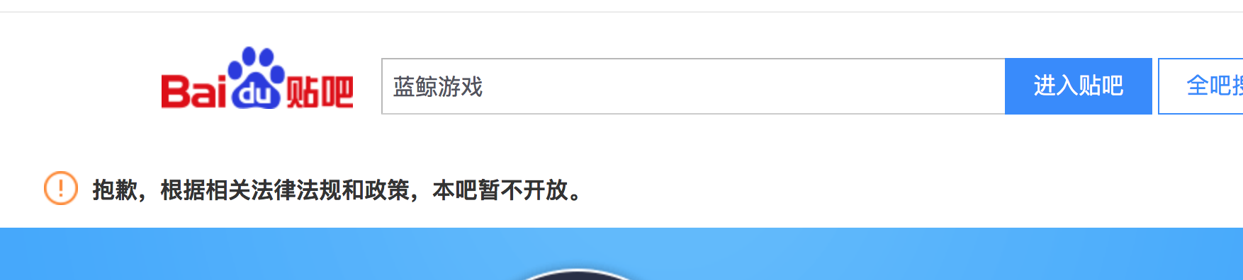 今天一种名为「蓝鲸」(或称「蓝鲸挑战」Blue Whale Challenge)的死亡游戏正由国外传进中国 有国内网友已经在社交媒体上组织相关代号为名的游戏群组,而参与者大多是青少年 游戏的主要内容是在规定时间内完成各种自虐任务,最终以自杀结束。 而一旦选择开始这个游戏,就不能退出,在发稿前不久,该贴吧已被关闭。