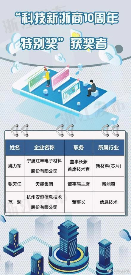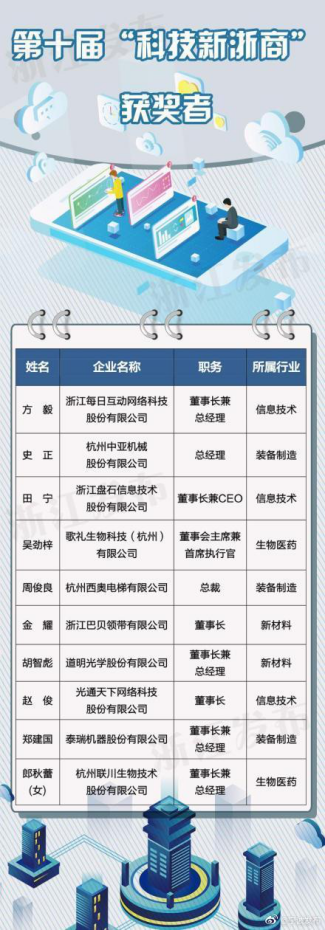 11月8日晚,由浙江省科技厅等单位联合指导的第十届“科技新浙商”颁奖典礼在杭州举行,新当选的10位科技新浙商和3位获得“科技新浙商致敬十年特别奖”的往届科技新浙商登台领奖。