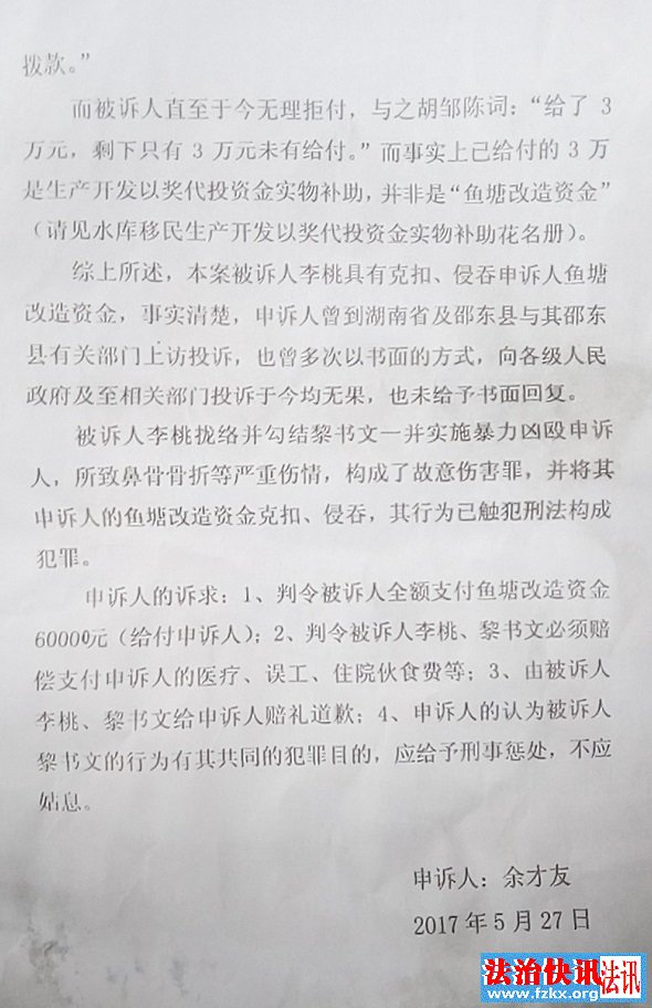 三峡移民找邵东县移民局长李桃查看现场被打伤 余才友移民到邵东时分的8分田是多年荒芜不能耕种的烂田,他也多次到移民局反映诉求。 2016年1月9日(周六),移民局长李桃和一班人开着公车到移民吴某某的农家乐玩,午饭后住隔壁的余才友找到准备上车的李桃,请他去查看下他的田不能耕种的现场。李桃一把将其拉进余才友堂屋,指使移民黎某某对其拳打脚踢。余妻报警后,李桃从后门逃走了。周一余拉上村文书以及刘乡长到移民局找李桃讨说法,他让余到医院检查。后鉴定为轻微伤。余才友被打之后一直无人解决此事。之后余找到刘乡长,他说给医药费4700元。余问这钱谁给的,刘说你别管谁给,给了就是。当场余才友签字,后来余才友收乡政府的银行转账。而其他应予给付的误工费、住院费等费用均未给付,更别说打人者被追究责任了。 ![]() ![]() 余才友申诉状 ![]() 鉴定为轻微伤 |