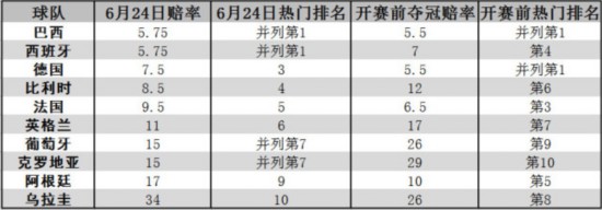 腾讯体育6月25日讯 截止今晨,世界杯小组赛第二轮全面结束。根据博彩公司更新的夺冠赔率,巴西、西班牙成为冠军最大热门,英格兰、比利时、葡萄牙、克罗地亚等队的夺冠热度上升,阿根廷、德国的热度下滑。 巴西成为世界杯冠军最大热门 根据Bwin公司的夺冠赔率,巴西、西班牙同以5.75的赔率并列成为最大热门,德国、比利时、法国、英格兰分列其后。夺冠呼声下滑最严重的当属阿根廷,赛会开始前的第5热门,如今以17的夺冠赔率,沦为第九热门。 巴西队小组赛开局不利,首战打平瑞士,第二战也是依靠补时绝杀才惊险击败哥斯达黎加。但是巴西队晋级形势明朗,末轮只需打平塞尔维亚就可确保出线。库蒂尼奥状态出色,内马尔也取得进球,大赛前就被认为是头号热门的巴西队,继续坐稳头号热门之位。 西班牙大赛前只是第四热门。但在豪强球队大多数表现不如预期的前提下,西班牙队发挥正常,首战因为C罗的神级发挥,西班牙憾平。次战西班牙稳健的击败伊朗,末轮只要打平就能确保晋级。科斯塔攻入3球状态出色,西班牙的整体发挥也有亮点,这使得西班牙一举跃升为跟巴西并列的头号夺冠热门。 世界杯最新夺冠赔率 德国队作为卫冕冠军,大赛开始前,是公认的最大热门。但是德国队小组赛发挥糟糕,首战输给墨西哥,次战也是依靠94分42秒的绝杀才惊险击败瑞典。无论是勒夫的排兵布阵,还是穆勒、厄齐尔等核心球员的状态,都是隐患。不过,德国队出线形势尚可,末轮只需要以2球或以上优势击败韩国就能确保出线。再加上德国队的医疗团队、板凳厚度和大赛经验都不容小觑,因此,出线形势微妙的德国队,仍然是第三大热门。 在G组,比利时队和英格兰队发挥出色。两队同以两胜、攻入8球的战绩提前晋级16强。两队的核心球员卢卡库、哈里-凯恩等人都有着极为出色的发挥,因此两支球队的夺冠热度都有所提升,比利时从赛会开始时的第6热门,晋升为第4。英格兰从第7热门,晋升为第6。但是本组中其他两队实力偏弱,此外,两队各有难题。比利时缺乏世界杯夺冠经验,英格兰队过于年轻,且近年来大赛战绩不佳。这都让两队无缘热门榜单的前五位。 法国队赛前是第3热门,小组赛前两战,法国队2-1击败澳大利亚,1-0击败秘鲁后,确保出线。末轮只要法国不输丹麦,就可以确保小组头名。但是法国队整体状态只能算是中规中矩。此外,必须看到:法国队若真是头名出线,可能被分入上半区,由于阿根廷、德国都可能是小组第二出线,都可能被分入上半区,因此法国队若是选择半区不慎,就可能前路艰险。法国队作为最早确定出线的豪门之一,却在热度榜单下滑,就有这层考量在内。 葡萄牙和克罗地亚队都拥有大赛最出色的巨星。C罗状态神勇,2战打入4球,葡萄牙末轮只要不输给伊朗就确定出线。克罗地亚亦是如此,2战6分后已经提前出线,末轮只要打平就能锁定头名,莫德里奇等核心大放异彩。两队的热度都有所提升,葡萄牙是开赛前的第9热门,克罗地亚是第10,但现在两队并列成为第7热门。不过两队虽有枪火全开的明星压阵,但是整体实力平平,很多位置球员都能力有限,过于依赖个体巨星,这也使得两队无法真正成为大热。 阿根廷无疑是夺冠赔率下滑最大的豪门球队。赛事前的第五热门,小组赛开局令人失望。首战被冰岛逼和,次战阿根廷更是兵败如山倒,0-3惨败给克罗地亚。好在,尼日利亚击败冰岛,拯救了阿根廷的出线希望,末轮阿根廷若能大比分击败尼日利亚,就能自主把握出线主动权。但尼日利亚战力不俗,阿根廷自身的状态确实太差,出线与否仍有变数。梅西状态低迷,更让阿根廷前景被蒙上阴云,因此阿根廷热度大跌。 (冷雪) |