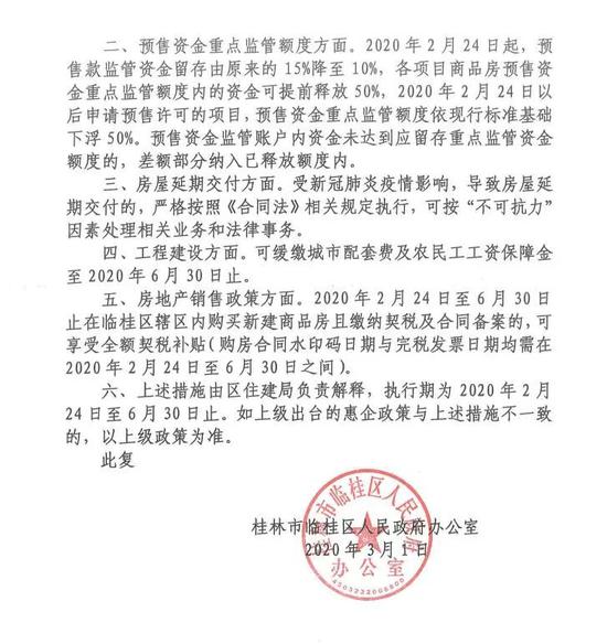 ![]() 3月1日,桂林临桂区人民政府办公室发布《关于临桂区房地产企业扶持有关问题的批复》,批复文件中关于临桂区房地产开发项目的房屋预售、延期交付、工程建设、房屋契税等问题提出相关措施,其中包括6月30日前在临桂购房可享全额补贴契税! ![]() ![]() 文件批复中提到:房地产销售政策方面 2020年2月24日至6月30日止在临桂区辖区内购买新建商品房且缴纳契税及合同备案的,可享受全额契税补贴。 ![]() 政策解读 就在今年2月25日,钦州市人民政府办公室发布通知:3月份在该市本级购买新建商品房(含住宅、商业、办公)的,按已缴契税为基数,契税补贴比例为100%;4月份契税补贴比例为80%;5、6月份契税补贴比例为50%。 相比钦州的相关措施,临桂区其次补贴力度更大,在2016年,临桂区曾对购买新建商品住房实行财政补贴,时隔4年,临桂购房契税补贴再现,政府扶持房地产企业的力度可见一斑。 桂林购房契税补贴的机会并不常见,4年前,补贴政策让桂林楼市转暖,今年上半年或许是在临桂买房的一个好时机…… 资料来源:临桂区人民政府办公室 |