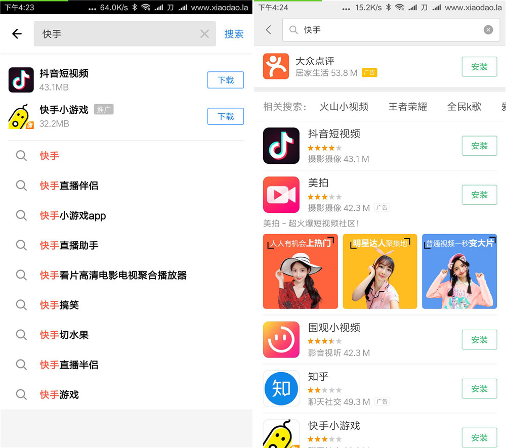 前几天还在讨论快手xx网红被封杀,今天下午16:49:57实测安卓所有应用商店无法下载“快手”