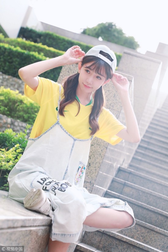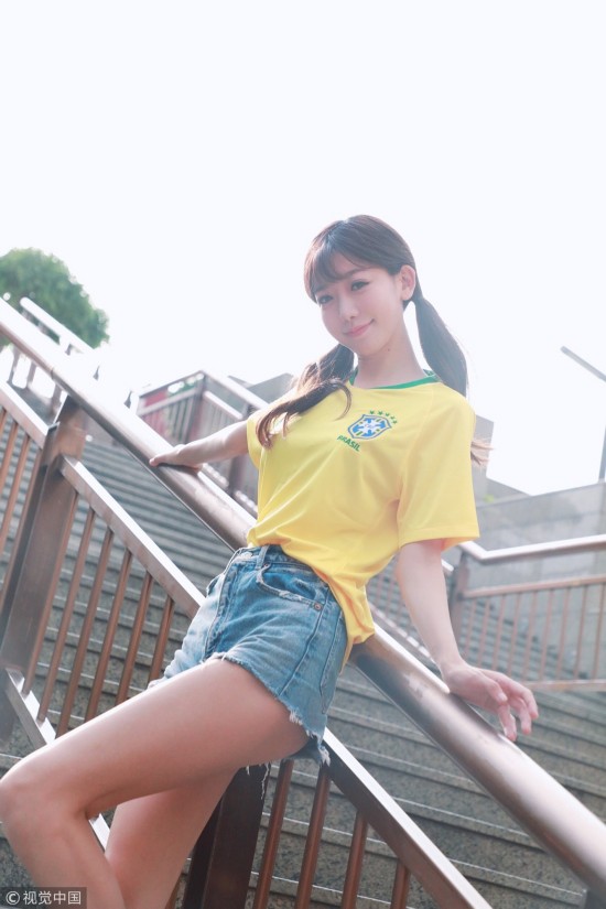 2018年6月25日,北京,“小林志玲”陈潇化身黄衫军团清纯亮相,皮肤白皙美腿修长,助威巴西队获胜。