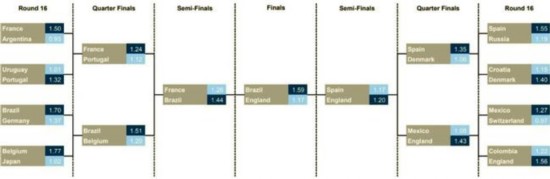 英格兰有望晋级决赛 世界杯即将进入淘汰赛阶段,16强即将全部产生。目前五星巴西尚未确定晋级,但世界著名集团高盛银行已经对本届世界杯决赛对手做出预测,对阵双方是巴西与英格兰! 从1998年的法国世界杯开始,高盛在世界杯之前都要发布一份关于世界杯经济学的研究报告。今年,高盛集团使用了一种预测模型模拟出本届世界杯的夺冠球队,他们共模拟了超过100万种结果。 一开始,高盛选择德国在决赛中对阵巴西,但看到德国开局失利,而英格兰轻松两连胜后,他们认为进入决赛的会是英格兰。 英格兰大胜后被看好 在预测中,英格兰将会排在G组小组第二位,比利时位列第一。英格兰将遭遇哥伦比亚,战胜对手后再面对墨西哥,而他们半决赛的对手则是世界冠军西班牙。 而巴西队首先将遭遇德国队,此后他们淘汰比利时和法国,与英格兰会师。 内马尔率巴西进决赛? 如果预测正确,那么英格兰将会自1966年夺冠以来再次闯入决赛,而巴西则是自2002年夺冠以来再次闯入决赛。巴西将会在1/8决赛淘汰德国 ,报1-7惨败的一箭之仇,而德国队将会遭遇自1978年以来的最差成绩。 高盛集团预测世界杯淘汰赛 然而,高盛还做了补充声明:随着比赛的持续升温,淘汰赛后比赛的赔率变得越来越低,特别是英格兰队。这体现在获胜的概率上,赔率越低,他们的决赛之路就会越轻松。鉴于淘汰赛阶段会有更多决定比赛结果的因素,我们认为法国队拥有最大的夺冠机会,其次是巴西、比利时和英格兰。 |