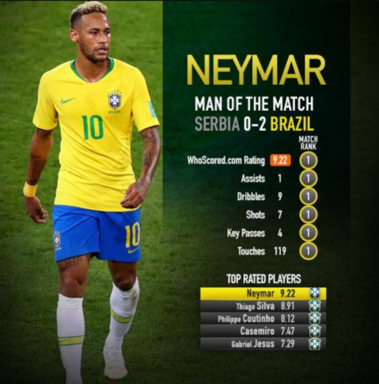 腾讯体育6月28日讯 内马尔3战1球1助攻,助巴西夺小组头名,射门、关键传球、制造犯规与尝试突破过人等4项进攻数据,内少均高居所有球员中的第一位(截止巴西一战赛后),其价值由此可见一斑。 内马尔伤愈复出后压力巨大,热身赛虽表现不俗连续进球,可世界杯比赛强度与肢体对抗级别完全不同,巴西首战平瑞士,内马尔无数次被对手撂倒在地,光被对手犯规就有10次,几乎与他抗议判罚的次数一样众多,可舆论与球迷赛后却吐槽这位巴西一哥摔倒次数太多,甚至是一碰就倒。 巴西是世界杯夺冠头号热门,却首战就受挫,次轮是非胜不可,然而对垒哥斯达黎加也是前90分钟始终未能破门,直到伤停补时阶段库蒂尼奥才打破僵局,随后内马尔打入本届大赛首球定胜局。进球后内马尔做出割喉的庆祝动作,而终场哨响后内少还坐在地上痛哭不止。非胜不可的压力,抗议裁判引起双方摩擦被出示黄牌等因素,都让巴西一哥压力巨大。 末战塞尔维亚是巴西的出线生死战,内马尔两次获得破门良机,可惜与上轮对垒纳瓦斯时情况类似,射门均被对手门将斯托伊科维奇奋勇扑出。不过内少还是通过角球传中助攻蒂亚戈-席尔瓦破门,两位巴黎圣日耳曼队友上轮曾发生摩擦,席尔瓦将球踢出界让对方疗伤,结果遭内少怒吼,巴西中卫顿感委屈,还将此事捅给媒体,这次进球配合后两人拥抱庆祝,应能解开心结化解矛盾。 内马尔1个进球1次助攻,助巴西拿下两连胜,强势反弹后拿下小组头名。不可否认的是,内少小组赛并未打出最佳状态,不过他依然是巴西场上最具威慑力的球员,制造威胁最多的主将:小组赛3战,巴西10号总计有4项数据排名所有球员第1,其作用依然是任何队友所无法取代的。 世界杯3战内马尔射门16次(C罗与克罗斯15射并列第2,米特洛维奇14射),尝试突破过人29次(梅西27次第2,伊斯科与沙特中场杜萨里均为21次),制造犯规17次(C罗13次第2,基米希12次第3),关键传球11次(与厄齐尔、基米希以及沙特中场法拉杰并列第1,库蒂尼奥与穆勒各10次),均是所有球员中最多的。 (Cuchu) |