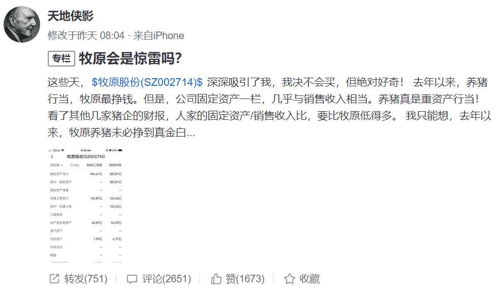 投资研报 【新能源汽车每日动见】暴增400%!这只股业绩预告透露行业重要信号 【硬核研报】库存又超预期下降?机构高喊“顺周期王者”产能利用率已破100%,量价齐升的弹性标的还有62%涨幅空间 【碳中和动态分析】2035年远景目标纲要要求大力提升清洁能源发电规模;晶盛机电获中环股份20.8亿订单 【硬核研报】新增产能被限制,价格天花板因素解除,“化工之母”跳出库存周期,迎来持续2年以上景气周期(名单) 原标题 正面刚!4000亿“猪茅”回应六大质疑,15万股东可以安心了?高毛利率、巨额关联交易…都有交代 ![]() 刚刚,牧原股份正面回应所有质疑。 3月16日晚间,牧原股份回复了《深交所关于对牧原股份的问询函》,其在回复中非常有针对性地回应了市场关心的焦点问题:高毛利率、大量工程关联交易、少数股东ROE远低于母公司股东ROE等。 ![]() 而在此前,雪球大V“天地侠影”曾发文公开质疑牧原股份,引发市场激烈讨论,质疑的问题主要围绕固定资产/销售收入比远高于其他猪企;少数股东ROE远低于母公司股东ROE;实际利润被控股股东旗下的建筑公司获取等。 本周的前2个交易日,牧原股份股价均绿盘报收,累计跌幅为5.76%,总市值也已跌破4000亿大关降至3815亿元。 牧原股份回应质疑,15万股东吃下“定心丸”? 经过市场激烈讨论后,3月15日,牧原股份受到深交所问询,3月16日晚间,牧原股份正面回应了市场关注的所有质疑问题,让15万股东吃下“定心丸”。 回应质疑一、固定资产占销售收入比重远高于同业。 针对“固定资产占销售收入的比重远高于同行业”的问题,牧原股份回复表示,公司的生猪养殖主要采用“全自养、全链条、智能化”模式,而同行业上市公司多采用代养模式,相对具有“轻资产”的特点,而全自养模式需公司自主投资建设生猪养殖场。故与同行业上市公司相比,公司固定资产占营业收入的比例较高、固定资产周转率较低。 ![]() 回应质疑二、生猪养殖毛利率明显高于其他上市猪企。 对于生猪养殖毛利率明显高于其他上市猪企,牧原回应称,主要原因系与种猪与仔猪来源、生猪产品结构和生猪养殖方式等存在差异,在生猪产品中,种猪、仔猪的毛利率明显高于商品猪的毛利率,而公司的种猪、仔猪销售量比例较大。 回应质疑三、与关联企业牧原建筑存在大量关联交易。 另外,关于质疑的焦点问题“与关联企业牧原建筑存在大量关联交易”,牧原股份给出了详细的回应,公司与牧原建筑之间发生的关联采购占当期采购总额的比例较低,均低于20%,且经过对比,牧原建筑承建的猪舍单方造价与非关联方建筑公司承建的猪舍单方造价差异率较小,牧原建筑承建猪舍的关联交易价格是公允性的。 ![]() 回应质疑四、少数股东ROE远低于母公司股东ROE。 同时,在回复函中,牧原股份回应了少数股东ROE远低于母公司股东ROE的质疑,其表示,主要原因系公司与华能贵诚信托、中央企业贫困地区产业投资基金等战略投资者合资成立的子公司均是在2019年末开始成立的,项目投资规模较大,但该部分子公司生猪养殖场的建设与产能形成需要一定的时间,故导致少数股东权益较大但少数股东损益较低,加权平均少数股东净资产收益率低于加权平均母公司股东净资产收益率。 回应质疑五、大存大贷。 最后,牧原股份对“大存大贷”的质疑也给出了回应,货币资金余额较高的主要原因是,业绩大幅增长导致经营性现金流量净额较大;为了扩大生产与建设规模、满足四季度集中采购和工程款支付的需求,公司通过增加银行借款的规模适当增加了现金储备量。 回应质疑六、短期借款和长期借款大幅增长。 关于短期借款和长期借款大幅增长的原因,牧原在公告中表示,公司生猪养殖采用“全自养、全链条、智能化”养殖模式,生猪养殖场区的扩建需投入大量的资金;另外,四季度是公司原料集中采购季节和工程款集中支付时段。 关于“猪茅”,一场刷屏的激烈辩论 牧原股份被深交所问询的“导火索”是,上周末的雪球大V“天地侠影”的一篇质疑文章。 3月13日(上周六),“天地侠影”发表了《牧原会是惊雷吗?》一文,对“猪茅”牧原股份提出多项质疑,其中包括:固定资产/销售收入比 ,远高于其他猪企;公司少数股东ROE远低于母公司股东ROE;实际利润被控股股东旗下的建筑公司获取等。 ![]() 文章发布后,“天地侠影”继续就牧原股份密集发表了诸多观点,质疑的点主要在于: 1、牧原股份的固定资产太高,几乎与销售收入相当,固定资产/销售收入远高于同行业其他上市公司; 2、牧原股份与控股股东旗下建筑公司存在大量的关联交易(过去两年约190亿元),质疑关联企业牧原建筑从上市公司赚了大钱; 3、少数股东ROE远低于母公司股东ROE,少数股东的ROE仅为13.98%,而归属母公司股东的ROE却高达47.88%,相当于这些少数股东在同上市公司做不挣钱的合伙生意。 这篇文章发布后,在资本圈引发激烈辩论,评论数量超2600条,参与讨论的更是不乏职业投资人、券商分析师等。 其实,经过周末的激烈讨论,该大V的质疑的主要问题都已经讨论清楚了。 首先,关于牧原股份的固定资产/销售收入占比过高的问题,有投资者在评论中表示,这是由牧原的重资产养猪模式决定的,从饲料厂到繁殖猪仔再到养猪场,牧原全部亲自下场,布局全产业链,而温氏股份等其他猪企,主要是外包养殖模式。 其次,关于少数股东ROE过低