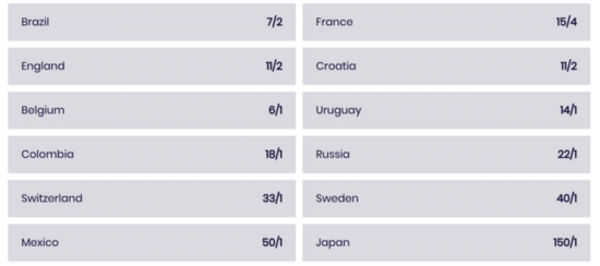 巴西仍大热 在西班牙与丹麦被淘汰之后,各大博彩网站纷纷更新了自己的赔率。根据《dabblebet》的数据显示,目前巴西仍然是夺冠最大热门,英格兰挤到第三。 在世界杯夺冠赔率上,巴西位居第一(3.5),西班牙出局之后,法国升到了第二(3.8),英格兰也因此排名上升到第三(5.5)。克罗地亚晋级后被看好升到第4,此前仅第8。 世界杯冠军球队排名 1 巴西 2 法国 3 英格兰 4 克罗地亚 5 比利时 6 乌拉圭 7 哥伦比亚 8 俄罗斯 9 瑞士 10 瑞典 11 墨西哥 12 日本 世界杯夺冠赔率 世界杯金靴最新赔率,凯恩仍在第一: 1 哈里-凯恩 2 卢卡库 3 姆巴佩 4 内马尔 5 格列兹曼 6 卡瓦尼 7 苏亚雷斯 8 阿扎尔 9 库蒂尼奥 10 久巴 世界杯金靴赔率 相关阅读: 西班牙世界杯注定会出局 皇马跟西足协都有责任 天助英格兰 !逆天封王之路开启 复制葡萄牙奇迹 (核桃) |