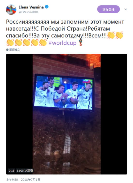 库娃的双胞胎 北京时间7月2日消息 昨天的俄罗斯世界杯1/8决赛,俄罗斯点球5-4淘汰了西班牙,克罗地亚点球4-3险胜丹麦。网坛众将也在关注这两场比赛,包括莎拉波娃、库尔尼科娃和沃兹尼亚奇等人。 俄罗斯美女库尔尼科娃在社交网络上晒出了他和西班牙情歌王子安立奎的双胞胎,一张照片是穿着俄罗斯特色的衣服,另一张则穿着西班牙队的球员。 莎娃和维斯妮娜都观看了这场比赛,俄罗斯晋级八强后,两人都非常激动。 沃兹尼亚奇为丹麦加油,看球的她十分紧张。 丘里奇则为克罗地亚加油,最终克罗地亚杀入了八强。 (double) |