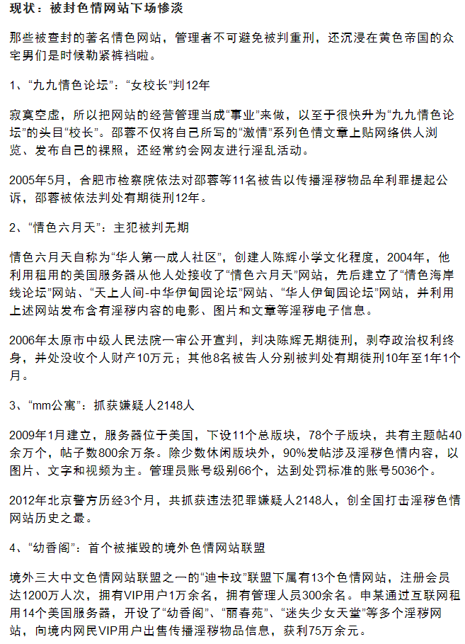 会所为什么关闭,看看下面的新闻就知道了,风声吹来了,如果会所现在还开着,我已经进去蹲着了,差不多都是判重刑 重刑:有期徒刑十年以上的罪犯和无期徒刑、死刑缓期二年执行和死刑犯 最少就是十年,吓尿了吧,上面查下来的时候 我提早关闭了会所,也不想在开了 现在中国网络管得非常严了 查到就是最少蹲监十年,如果我进去了,娱乐网谁管理? 大家要考虑以后 不要为了十块钱,乱骂人喊什么跑路狗 不懂背后的原因 就不要说 会所的事情 也不要在问了也不要提了 另外跟大家说一下,现在冒出来那些草榴社区啊,开放注册,推广多少人激活 都是假的,源码已经在XX网赚论坛开源了 真草榴已关闭 有些人就是天真也不知道自己多逗还在推广注册链接,真草榴是不会开放注册的 草榴的帐号非常不好搞 如果谁想开 不怕死的 你就开 网监查到 少则10年 重则直接枪毙 不是开玩笑的,还有杨幂视频这个也是, 如果之前为了人气我在网站发布了这个视频,现在也是进去了,传播几千下载就能够蹲几年牢了 何况杨幂已经报警要追究传播者 PS:传播视频 比制作视频被判得还要严 目前杨幂视频拍摄者已经被抓(有些为了卖杨幂视频赚点小钱的 1元卖 我也是笑了!)
