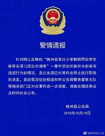 ![]() 人民网北京10月18日电 据湖南省株洲县公安局官方微博消息 ,针对网上反映的“株洲县育红小学教师罚站学生被带至渌口派出所调查”一事中派出所副所长赵某有违规行为的情况,县公安局已对其作出停止执行职务的决定,县纪委派驻纪检组和市公安局警务督察支队等相关部门正对此事作进一步调查,调查结果会及时向社会公布。 事件回顾: 据网友称,10月16日上午8点多,株洲县育红小学三年级某班27岁女教师被该县渌口镇派出所几个警察直接从教室带走,在审讯室里,被关了7个多小时,下午3点左右才被放出。事情的起因是,班里的一个女孩因为迟到,该老师让她在教室前面站了几分钟。罚站女学生很快通过电话联系到家长,孩子爸爸报案后,跟着警察到学校将女教师带到派出所。 针对网传的“小学女教师因罚站迟到学生,被家长报警后带入派出所调查7小时”一事,湖南株洲市株洲县委宣传部相关负责人10月18日下午回应称,情况基本属实,目前当地纪委已介入调查。 |