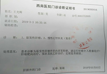 王光辉夫妻于2019年2月14号进厂报到,当晚发病进入乐清市第二人民医院住院检查,花了几万元检查费无明确结果后,夫妻二人当即返回老家重庆,转入重庆市第三军医大进行复诊,于3月3日确诊为肝癌晚期。这期间公司无任何人联系慰问王光辉。