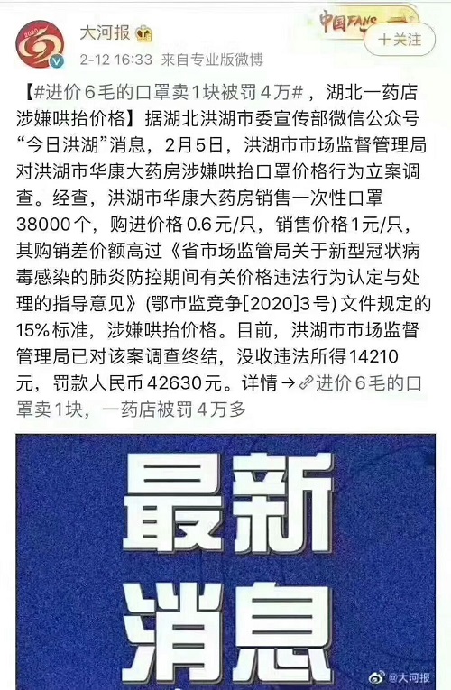 湖北,你是在侮辱国民的智商还是? 独立撰稿人 李海波 据人民日报报道:按照湖北省指挥部部署,省市场监管局等部门门]积极协调武汉小药药医药科技有限公司,加强民用口罩市场供应,13日已筹集首批50万只民用口罩,通过武汉小药药公司销售网络投向武汉商务企业和零售药店。目前,已经有同济堂、好得快、中联等药房共1235家零售药店参加销售,并悬挂对应销售标识。据了解,武汉小药药公司采取补贴运费、税费等方式,按照进货价1元/只供应零售药店,并要求零售药店张贴告示按2元/只平价向市场供应。 那你们可知道,就在一天前的报道里你们湖北的洪湖市还处罚了一家药店的事情?在2月12日的报道《湖北一药房被罚:将0.6元进价口罩卖1元 涉嫌哄抬价格》据湖北洪湖市委宣传部微信公众号“今日洪湖”消息:2月5日,洪湖市市场监督管理局对洪湖市华康大药房涉嫌哄抬口罩价格行为立案调查。经查,洪湖市华康大药房销售-次性口罩38000个,购进价格0.6元/只,销售价格1元/只,其购销差价额高过《省市场监管局关于新型冠状病毒感染的肺炎防控期间有关价格违法行为认定与处理的指导意见》(鄂市监竞争[2020]3号)文件规定的15%标准,涉嫌哄抬价格。目前,洪湖市市场监督管理局已对该案调查终结,没收违法所得14210元,罚款人民币42630元。 网友也在说执法有问题啊! 评论都说洪湖市华康大药房是良心商家啊! |