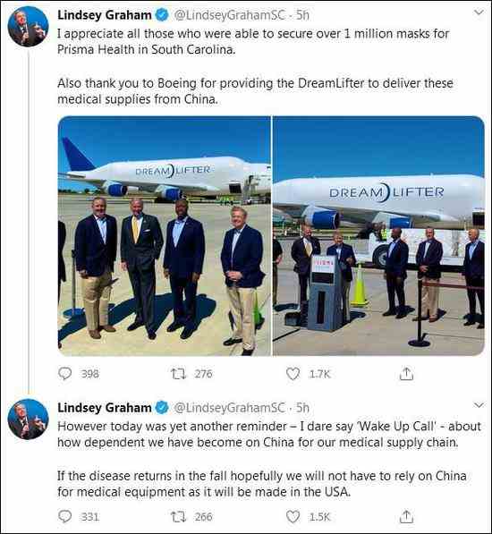 | [文/观察者网 徐蕾]据美联社当地时间4月26日报道,当天,美国南卡罗莱纳州接受了来自中国的150万个外科口罩。 在格林维尔-斯帕坦堡机场(Greenville-Spartanburg Airport)的停机坪上,看着这些口罩从波音飞机上卸下后,南卡罗莱纳州共和党参议员林赛·格雷厄姆(Lindsey Graham)说,“我们想要美国制造的口罩,我们不想依赖中国或其他任何国家来满足我们基本的医疗需求。” 格雷厄姆说,他预计今年秋天新冠病毒会卷土重来,他希望美国在出现疫情之前对所需的供应“有更好的准备”,希望“医疗供应链正在回到美国”。 当天,格雷厄姆还发推特表示感谢,但也感叹,希望美国减少对中国的依赖。 “我感谢所有为南卡罗莱纳的普利斯马医院提供了100多万个口罩的人们。也感谢波音公司提供波音747梦想运输机 (Dream Lifter) ,从中国把这些医疗用品运过来。” “然而,今天再次提醒我们——我敢说‘醒醒吧’——我们的医疗供应链已经变得如此依赖中国。如果疾病在秋天卷土重来,希望我们不会再这样依赖中国的医疗设备,希望这些是美国制造。” ![]() 格雷厄姆随后在转发美联社报道的同时,又一次强调称:“我们想要美国制造的口罩,我们不想依赖中国或其他任何国家来满足我们基本的医疗需求。” ![]() 推特截图 美联社报道称,在疫情暴发的整个过程中,格雷厄姆一再呼吁美国减少对中国的依赖,在推特、媒体采访中,他都表达过类似的观点。 美国众议员威廉·蒂蒙斯(William Timmons)16日回应格雷厄姆称,必须从中国进口口罩“这种事情不会再发生了”。 据南卡罗来纳州官方数据,截至26日,该州有近5500人的新冠病毒检测结果呈阳性,其中至少有174人死亡。26日从中国运去的150万个口罩足够该州普利斯马医院使用一个月。此外,在这批货物中,有10万个口罩正被送往南卡罗来纳医科大学。 自疫情在全球暴发以来,各国都十分依赖中国提供的口罩等医疗用品。美国、法国、加拿大等国均多次派专机前来中国提口罩。但是同时,美国对中国医疗用品的依赖感到无奈。 纽约州长科莫在4月17日的发布会上就提到了中国,他表示,“我们需要的口罩来自中国,我们需要的手术服来自中国,我们需要的防护面罩来自中国,我们需要的呼吸机来自中国。好了,我们过了那个阶段了,现在到了新阶段,我们需要检测药剂,也来自中国……怎么会这样!” |