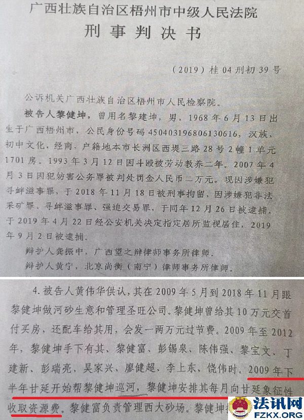 法院认定:2010年1月19日,梧州市水利局、国土资源局、航道管理局联合发布公告,将浔江长洲水利枢纽以下至西江界首划定为全面禁止开采河砂的河段(即禁采区)。2010年1月至2013年间,黎健坤为获取非法利益,在明知上述河段已全面禁止开采河砂的情况下,仍然安排丁建新、廖健超和黎健富、黄伟华、彭锡泉、黎宝文、等人在上述河段盗采河砂......安排甘延负责在长洲区龙新村沙场盗采河砂并负责在长洲岛河段组织非法巡逻。
