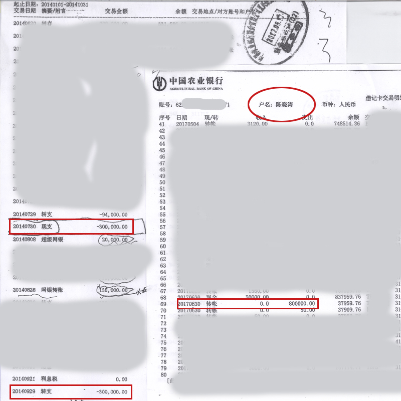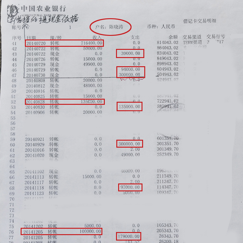 ▲知情人2019年拍摄 从知情人提供的中国农业银行银行卡交易明细清单看,(账号62XXXXXXXXXXXXXXXX1)账户名陈晓涛在2014年7月20日通过转账确实收入了71.64万元,是收入金额最大的一笔,金额小的有13.5万、10万等情况。从支出上看,有3万、9.4万、9.7万、13.5万、17.9万、30万、30万,还有一笔支出金额高达80万元,转支时间为2017年6月30日。 ![]()
