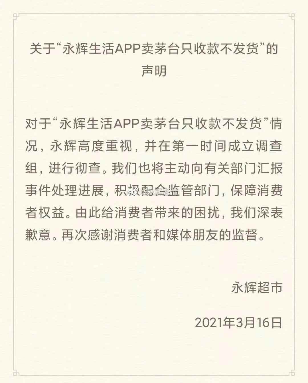 | 炒股就看金麒麟分析师研报,权威,专业,及时,全面,助您挖掘潜力主题机会! 卖茅台只收款不发货?永辉超市遭投诉,回应来了 “现在大家都知道永辉有茅台卖了。”一位网友评论道。 “315”之后,一则“永辉生活APP卖茅台只收款不发货”的消息冲上热搜:在江苏南京,多位消费者通过永辉生活APP下单几万元茅台酒后,至今无法取货,也无法退款。而指定提货地的永辉超市门店负责人却一问三不知,客服则表示系统显示已签收。 ![]() 图片来源:视觉中国 永辉超市什么时候开始卖茅台了? 1月20日,永辉超市发布公告设立酒类业务全资子公司,专门用于承接和运营酒类业务,公司名称暂定为福建咏悦汇商业管理有限公司(以下简称咏悦汇),注册资本1亿元。 今日(3月16日),《每日经济新闻》记者在永辉生活APP搜索“预约茅台”相关信息,搜索结果出现了贵州茅台酒(喜宴红)43度500ml、茅台王子酒53度金王子500ml等商品。 ![]() 永辉生活APP搜索茅台的显示结果 图片来源:永辉生活APP截图 商品详情界面显示,咏悦汇是永辉超市股份有限公司旗下酒类品牌,专注“全球好酒,保真直供”的专业酒类服务,囊括白酒、普通酒、啤酒、西式烈酒、预调酒/其他酒或黄酒补酒、酒具配套等七大品类。 按照永辉生活APP上的说法,咏悦汇的O2O模式支持消费者线上线下便捷购买,消费者可以在任意一家悦咏汇门店体验酒类专员的荐酒服务,也可在永辉生活APP及永辉各合作电商平台下单,咏悦汇提供送货上门服务。商品详情界面还特别重点强调了“即时送”(当日送达)或“隔日达”(三日内送达)的信息。 ![]() 永辉生活APP对咏悦汇平台的介绍 图片来源:咏悦汇APP截图 记者将定位改为南京,搜索茅台并进入购买界面,同样可以看到咏悦汇的相关介绍,下单界面有配送和自提两个选项,配送时间显示最快60分钟送达。 3月16日午间,永辉超市官方微博发布声明称,对于“永辉生活APP卖茅台只收款不发货”情况,公司已经成立调查组彻查,将配合有关部门汇报事件处理进展。 ![]() 永辉超市今天发布的声明 图片来源:永辉超市官方微博 记者也在第一时间联系永辉超市官方人员。对于消费者投诉的相关问题,对方并未作出具体解释。记者尝试联系永辉超市董秘办,但电话未能接通。 《每日经济新闻》记者梳理发现,永辉超市2011年年报中就提到,已经开始尝试“咏悦汇”葡萄酒专卖店经营模式。2019年底,永辉超市提出计划单独孵化酒类项目,并针对这一垂直品类进行数字化转型工作,通过构建产品矩阵体系、店中店改造、全渠道营销等模式,持续加码酒类项目布局。 2020年7月,永辉超市推出酒类项目旗舰店咏悦汇,并于当年7月25日在成都、重庆、福建、北京四地开业。 启信宝信息显示,福建咏悦汇商业管理有限公司成立于2021年1月20日,企业注册地址为福建福州,公司法定代表人为吴光旺,现任永辉超市执行副总裁。 2月下旬,记者在上海永辉超市探店时就有员工表示,作为门店引流产品,店内有少量茅台销售,但需要提前预定,并且该员工强调基本抢不到。 扫二维码,3分钟极速开户>> 海量资讯、精准解读,尽在新浪财经APP 责任编辑:杨红卜 |