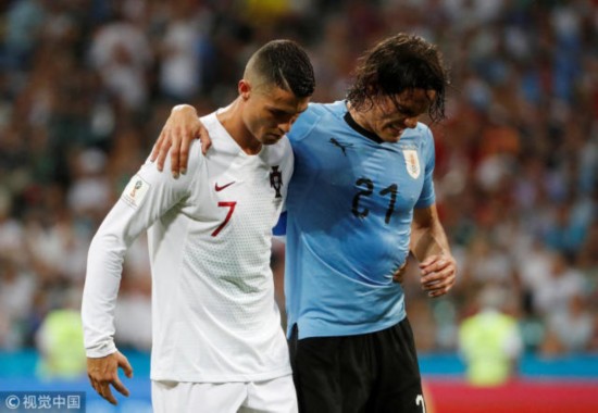C罗搀扶卡瓦尼 但我们惊喜地看到,随着人生历练的增长,C罗也学会了坦然接受失败的到来。输给乌拉圭后,C罗非常大度地祝贺了卡瓦尼和苏亚雷斯的胜利,在卡瓦尼受伤时,他也主动伸出了友谊之手,搀扶卡瓦尼走到场边治疗,这在以往,显然是难以想象的画面。 爱哭的C罗,这一次强忍泪水没有哭泣,他在赛后向球迷致意的画面也感动了很多人。包括那些在开场阶段,用疯狂嘘声想要干扰C罗的乌拉圭球迷,也给他献上了掌声。C罗就是这样的,他身上散发出来的魅力和比赛精神,是连敌方也能够折服的! 无需靠世界杯正名 不夺冠也是世界最佳 赛后,有人在社交网站上调侃说,C罗和梅西这两个最大的“伪球王”可能来得及就伴一起回西班牙。玩笑开得确实有些过分,但这也牵出了一个不可避免的问题,说梅西没有世界杯无法称之为球王,那么C罗呢,没有世界杯他的地位会下降吗?
