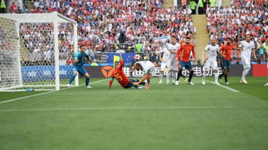 拉莫斯庆祝进球 北京时间7月1日22:00(莫斯科当地时间17:00),2018年世界杯1/8决赛第三场比赛在卢日尼基球场展开角逐,西班牙4比5不敌俄罗斯,伊格纳舍维奇自摆乌龙,久巴点球扳平。双方120分钟内1-1战平。点球大战,西班牙3-4落败出局。 俄罗斯此前6次对阵西班牙仅2平4负未尝胜绩,其中双方去年11月曾在圣彼得堡3比3战平。西班牙小组赛1胜2平夺头名出线,但此前4次在大赛中对阵东道主从未取胜,纳乔、科凯和阿森西奥轮换出场。俄罗斯在最后一场小组赛失望落败,库兹亚耶夫、戈洛文、日尔科夫和费尔南德斯轮换出场。 俄罗斯开场后压缩防守空间坚持稳守反击,西班牙则耐心控球寻找机会。西班牙第11分钟取得领先,日尔科夫对纳乔犯规,阿森西奥右路任意球传中,伊格纳舍维奇背对来球防守拉莫斯,皮球打在俄罗斯后卫腿上偏转入网。38岁352天的伊格纳舍维奇成为世界杯中打入乌龙球最年长球员。这也是俄罗斯第4次定位球失分。