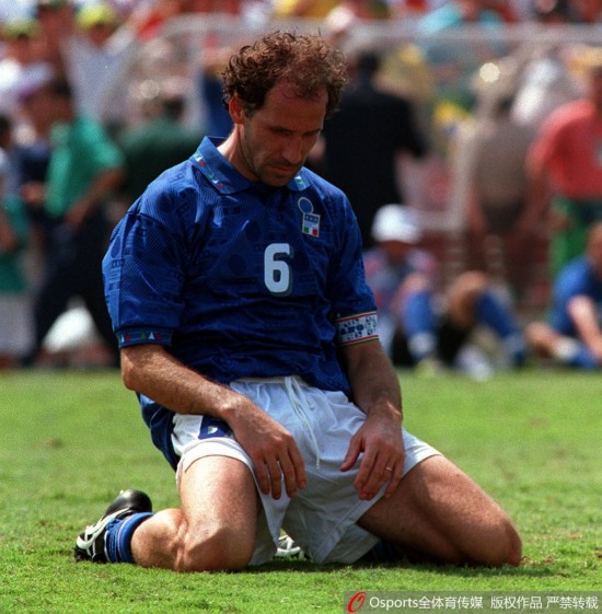 1994年美国世界杯决赛:巴西0:0(点球3:2)胜意大利 功臣巴乔罚失最后点球 意大利队巴雷西错失点球后跪在地上。