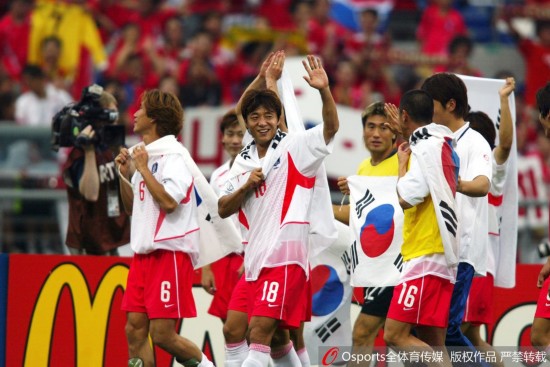 2002年韩日世界杯1/4决赛:韩国队5:3点球淘汰西班牙 韩国队柳相铁、黄善洪等队员身披国旗走向场边。
